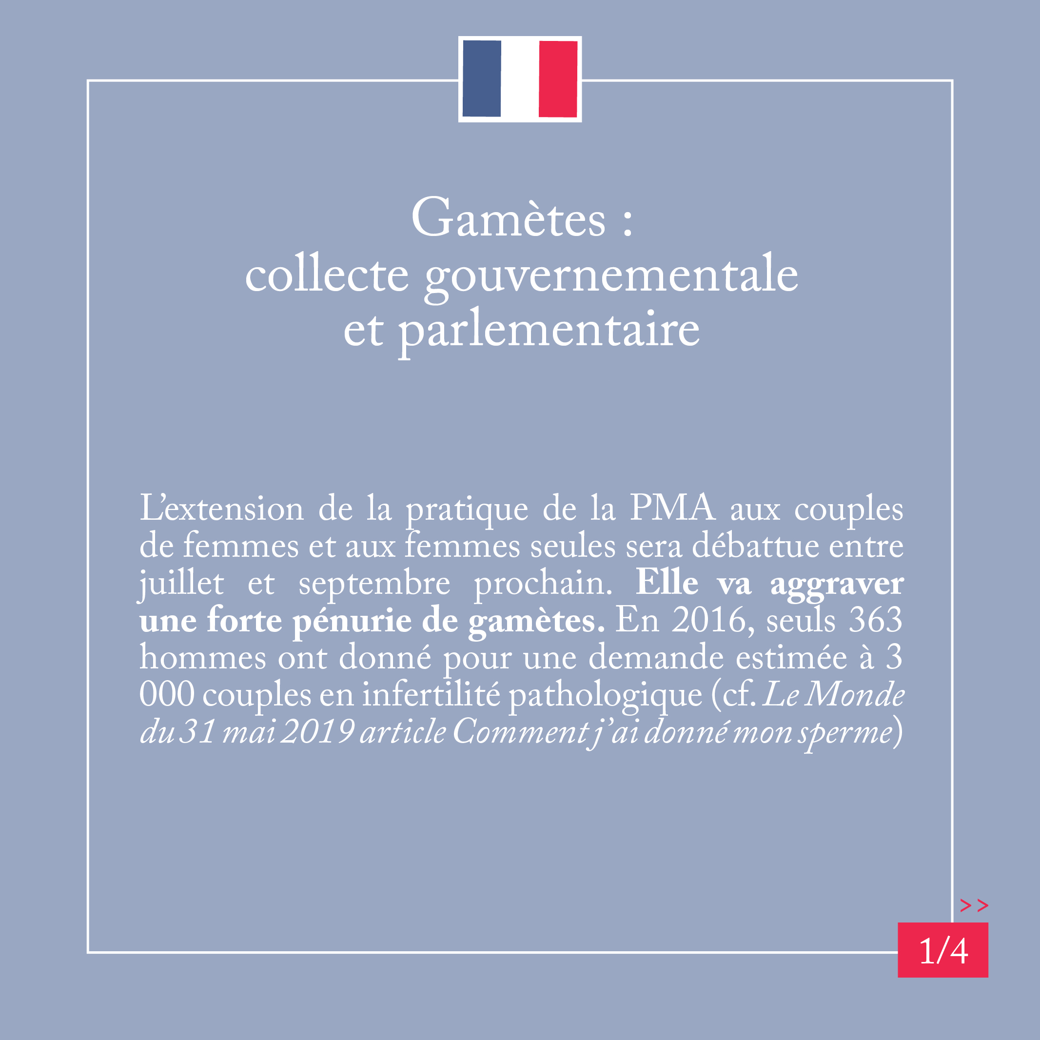 L’extension de la pratique de la PMA aux couples de femmes et aux femmes seules sera débattue entre juillet et septembre prochain. Elle va aggraver une forte pénurie de gamètes. En 2016, seuls 363 hommes ont donné pour une demande estimée à 3 000 couples en infertilité pathologique (cf. Comment j’ai donné mon sperme – Le Monde – 31 mai 2019).