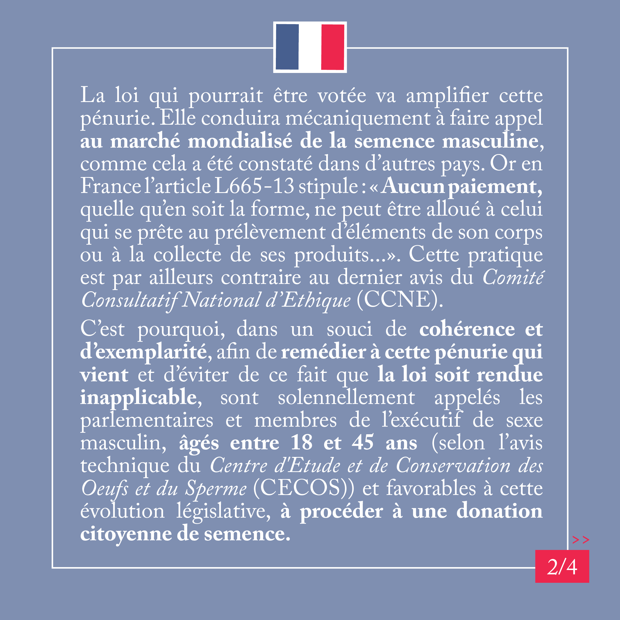C’est pourquoi, dans un souci de cohérence et d’exemplarité, afin de remédier à cette pénurie qui vient et d’éviter de ce fait que la loi soit rendue inapplicable, sont solennellement appelés les parlementaires et membres de l’exécutif de sexe masculin, âgés entre 18 et 45 ans (selon l’avis technique du Centre d’Etude et de Conservation des Oeufs et du Sperme (CECOS)) et favorables à cette évolution législative, à procéder à une donation citoyenne de semence.