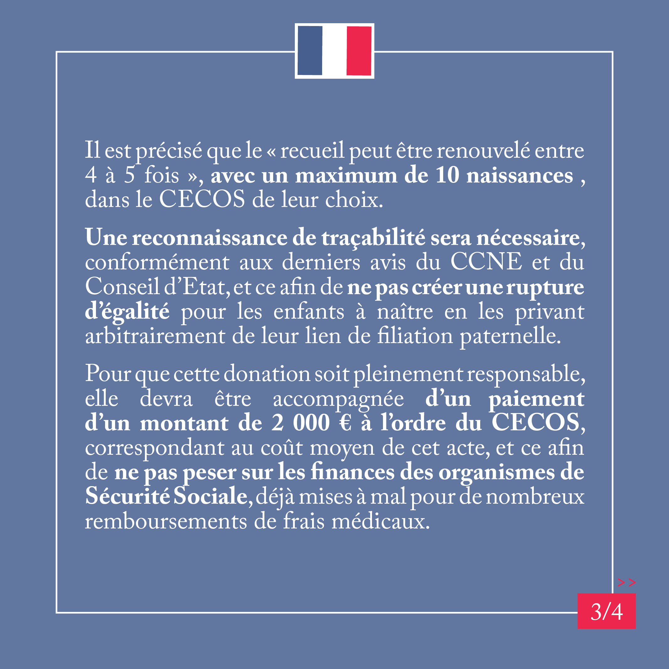 Une reconnaissance de traçabilité sera nécessaire, conformément aux derniers avis du CCNE et du Conseil d’Etat, et ce afin de ne pas créer une rupture d’égalité pour les enfants à naître en les privant arbitrairement de leur lien de filiation paternelle.